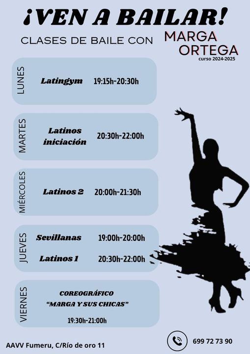 Además de los denominados «bailes latinos», añade a su repertorio las sevillanas y otras actividades más bien tipo gimnasia, que denominan «Latingym».